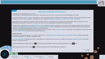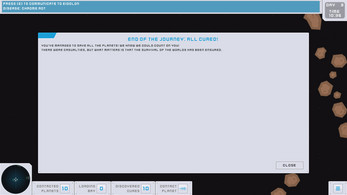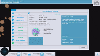 The aim of the game is to find the cure for the ten diseases that plague the planets and provide each one with the components to save the population: contact planets, discover diseases, recover components and deliver them to the planet that needs them.